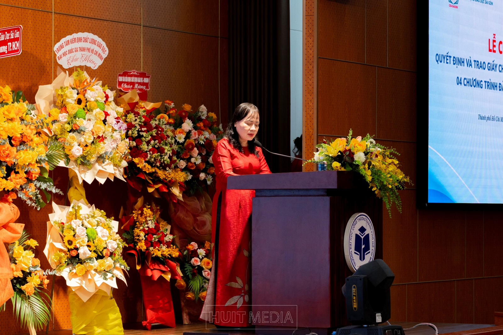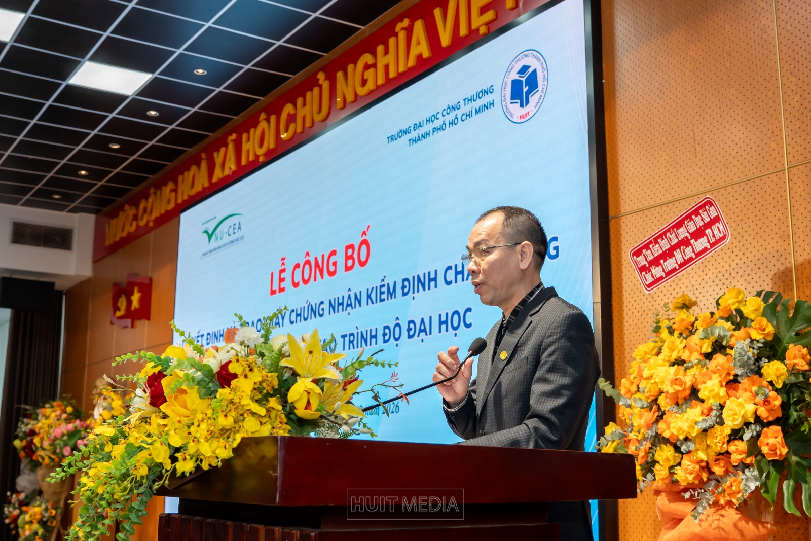 Cũng trong buổi lễ, PGS. TS. Đinh Văn Dũng đánh giá cao việc HUIT đã chuẩn hóa quy trình làm việc với những minh chứng khách quan, và việc trao Giấy chứng nhận là một trong những đích đến của quá trình làm việc hiệu quả tốt để nâng cao, cải tiến và phát triển chất lượng giáo dục của Nhà trường đồng thời ghi nhận những nỗ lực nghiêm túc, bài bản và tinh thần cầu thị của Trường Đại học Công Thương TP.HCM trong công tác tự đánh giá, cải tiến liên tục và nâng cao chất lượng đào tạo.