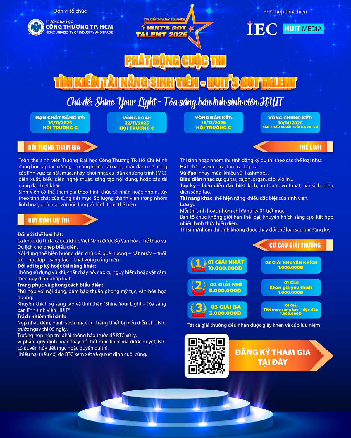 Nhằm tạo sân chơi văn hóa – nghệ thuật lành mạnh, góp phần rèn luyện và phát triển kỹ năng, phẩm chất và năng khiếu của sinh viên, tạo môi trường để sinh viên phát huy năng khiếu, thể hiện bản lĩnh và lan tỏa tinh thần tích cực trong học tập, sáng tạo và cuộc sống. Trường Đại học Công Thương TP. HCM thông báo phát động cuộc thi Tìm kiếm tài năng sinh viên – HUIT’s Got talent 2025” Chủ đề “Shine Your Light – Tỏa sáng bản lĩnh sinh viên HUIT